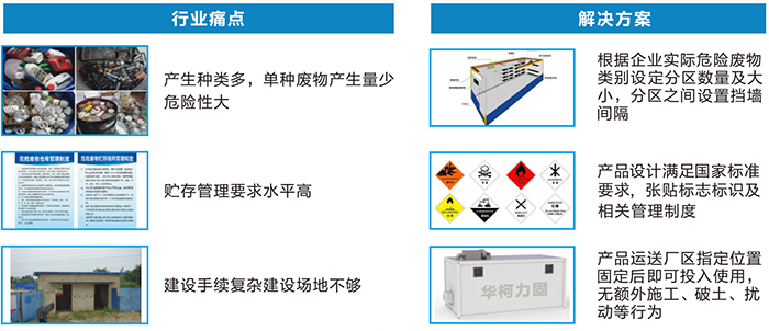 本产品将危险废物分类分区贮存、防水防渗、事故拦截收集、消防应急、物联网数据采集及监控等设施集成于成品仓库中,搭载自主研发智慧化管理服务平台,打造一套完整的环境智能监测与风险防控体系帮助企业搭建安全、绿色、智能的生产环境,实现危险废物智能化、规范化贮存,为企业危险废物贮存全过程信息化管理提供保障。